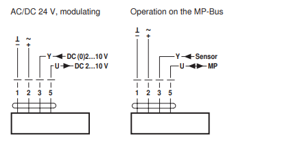 Привод EV24A-MP-RE принимает нужное положение согласно цифровому сигналу, полученному от контроллера высшего уровня по MP-Bus сети. Сигнал обратной связи при этом не отображает положение привода, а является коммуникационным интерфейсом.