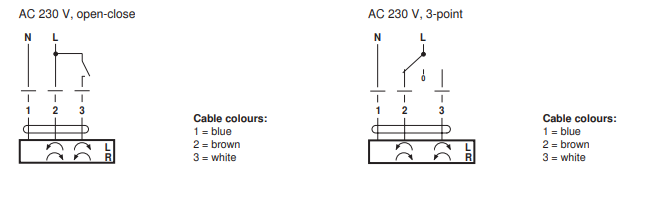 Управление электроприводом Belimo CM230G-L осуществляется либо по 3-позиционной схеме, либо по схеме "Открыто-Закрыто".