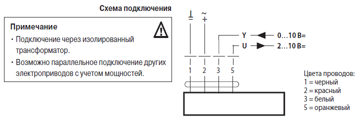 Команды на электрический привод BELIMO NM24A-SR передаются посредством аналогового сигнала типа 0 … 10 V (стандарт), который посылает команду об открытии/закрытии заслонки. Текущее положение привода можно понять по значению номинального напряжения.