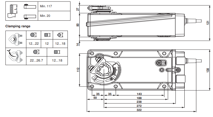 Электропривод Belimo EF24A-MF поставляется со специальным крепежным захватом, который упрощает процесс установки привода на заслонку. Также для предотвращения произвольного вращения устройства в процессе работы привод закрепляется фиксатором.