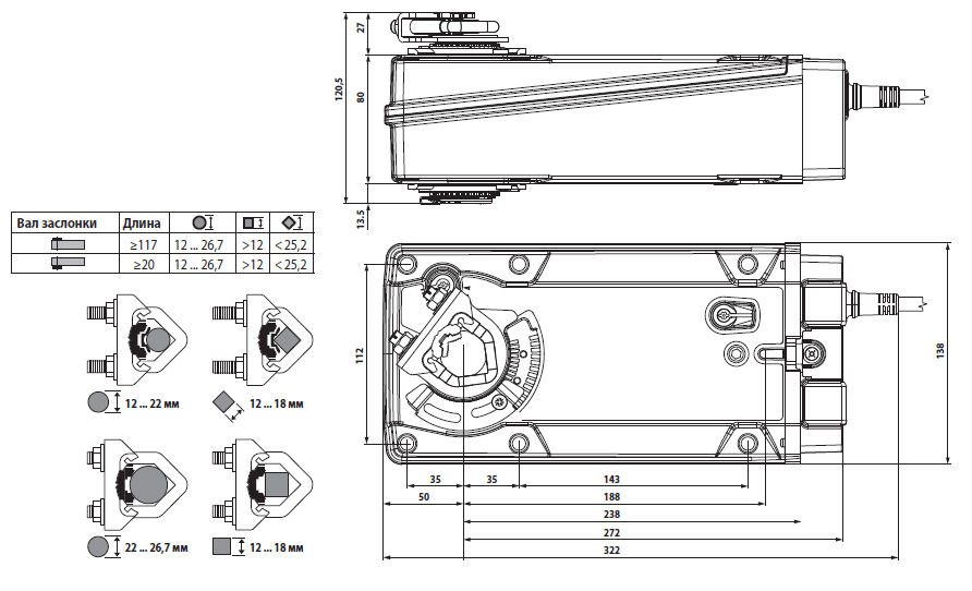 Привод монтируется на заслонку посредством захвата. Возможно ограничение вращения посредством фиксаторов.
