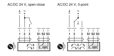 Работа электропривода Belimo NM24A-S-TP регулируется 2-мя способами: по 3-позиционной схеме либо по принципу "Открыто-Закрыто".