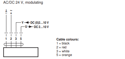 Электропривод Belimo SF24A-MF управляется аналоговым сигналом в интервале от 0 до 10 В, согласно которому привод занимает нужное положение. Текущее положение привода (0-100%) показывает сигнал обратной связи U, который также может управлять другими электроприводами. Одновременно с перемещением привода в заданное положение происходит взвод пружины, которая в случае аварийного отключения питания вернет заслонку в первоначальное защитное положение.