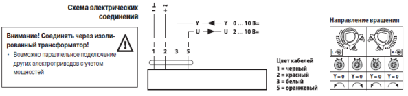 После включения привода Белимо SF24A-SR и переходе устройства в рабочее положение происходит взвод пружины с возвратной функцией. После отключения электричества электричества пружина возвращает привод в стартовую позицию. Регулирование положение происходит согласно сигналу от 0 до 10 V=.
