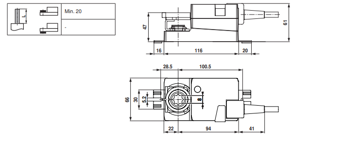 Для установки привода Belimo LMC24A-SR-F на заслонку предусмотрены крепежные зажимы с обеих сторон корпуса и шпиндель с осевым отверстием.