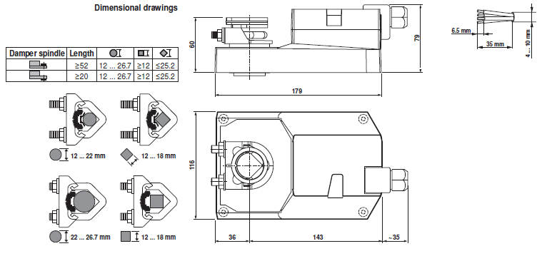 На воздушную заслонку электропривод Belimo GM24A-MF-TP монтируется посредством универсального захвата, поставляемого вместе с приводом. Также в базовую комплектацию входит предотвращающий произвольное вращение привода фиксатор.