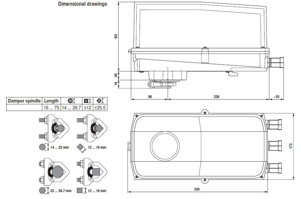 | Override control | MAX (maximum position)= 100% MIN (minimum position)= 0% ZS (intermediate position, AC only)= 50% |