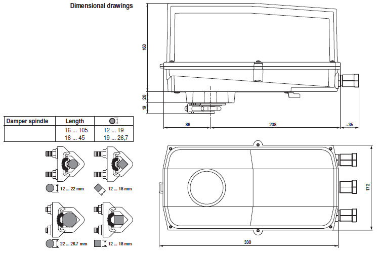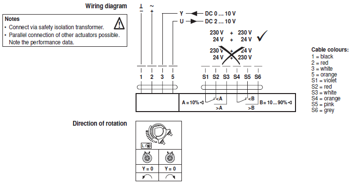 | Auxiliary switch | 2 x SPDT, 1 mA ... 3 (0.5) A, AC 250 V (1 x fix 10% / 1 x adjustable 10 ... 90%) |