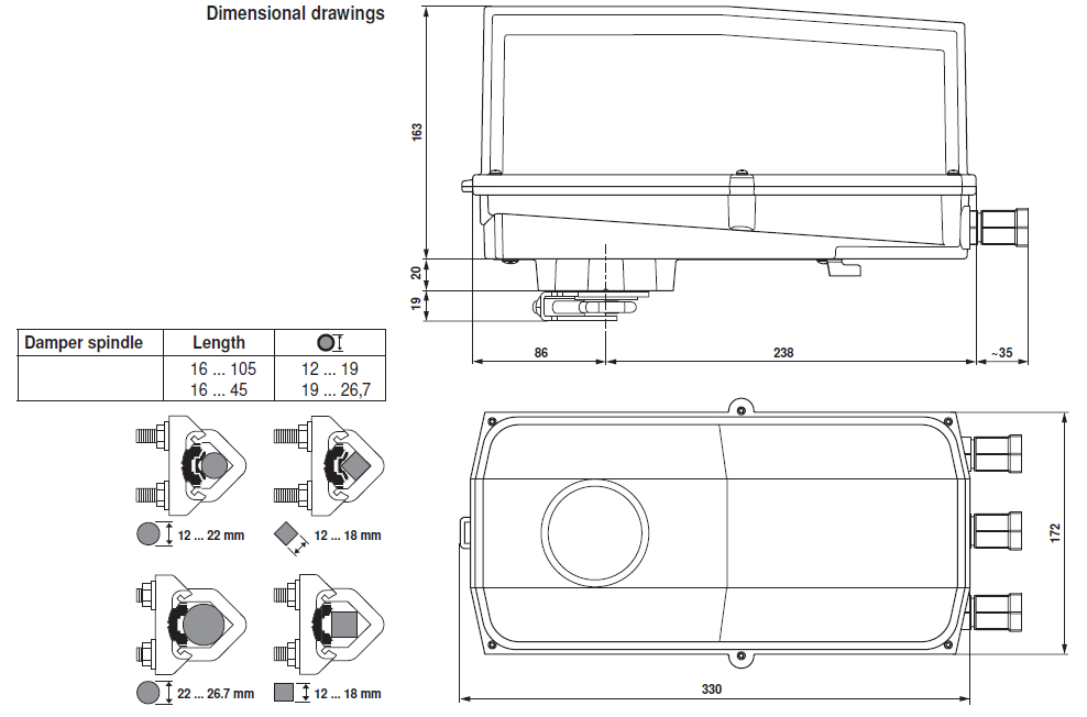 | Angle of rotation | Max. 95°, can be limited with adjustable mechanical end stop |