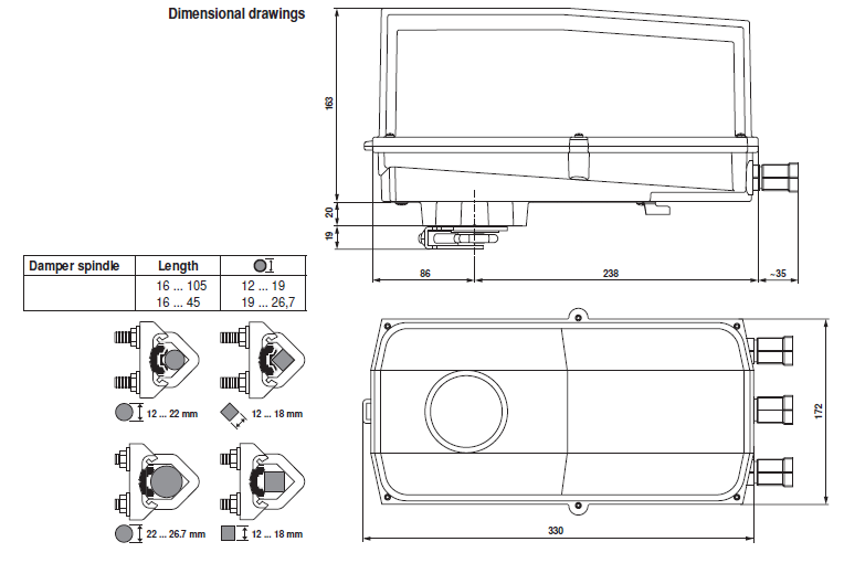 | Auxiliary switch | 2 x SPDT, 1 mA ... 3 (0.5) A, AC 250 V (1 x fix 10% / 1 x adjustable 10 ... 90%)) |