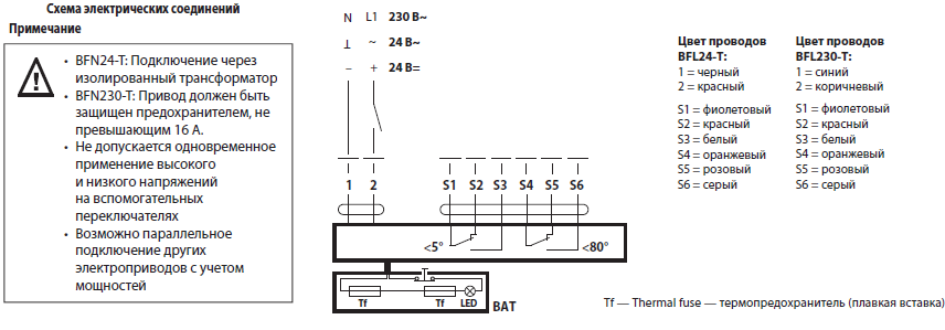 Электропривод Belimo BFN230-T оснащен терморазмыкающим устройством ВАТ, включающим в себя 2 предохранителя (плавкие вставки). Один из предохранителей активируется при превышении окружающей температурой границы 72°С, второй - при превышении этой границы температуры внутри клапана. При срабатывания обоих предохранителей электропитание отключается, и дальше использовать электропривод невозможно.