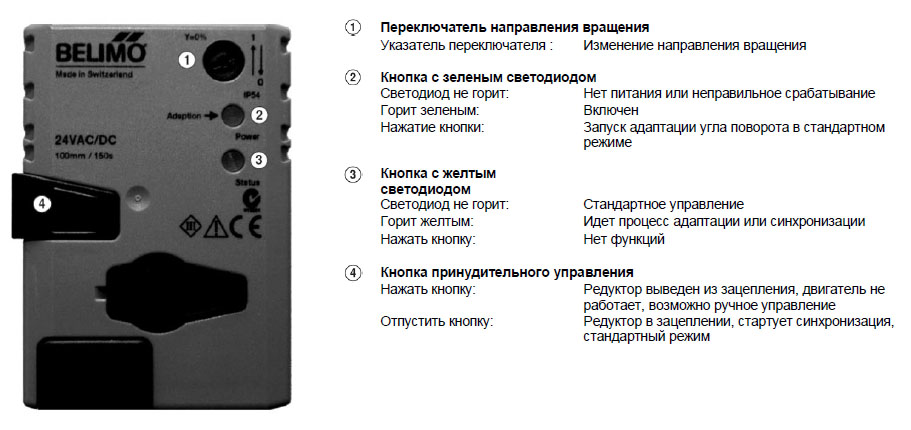 Предусмотрено управление электроприводом Belimo NRQ24A-SZ вручную. Для активации режима нажать самовозвратную кнопку, расположенную на корпусе. После этого зубчатый редуктор привода будет выведен из зацепления.