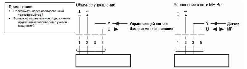 При управлении в сети MP-Bus нужное положение открытия задается цифровым сигналом. Сигнал обратной связи U является интерфейсом коммуникации.