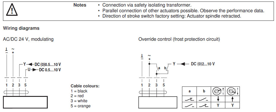 | Emergency setting position | Actuator spindle 0...100%, adjustable (POP rotary button) |