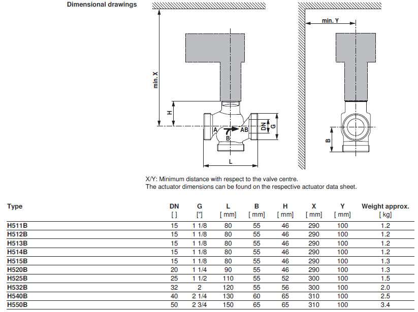 | Leakage rate | Control path A - AB: max. 0.05% of the kvs value, Bypass B - AB: max. 1% of the kvs value |