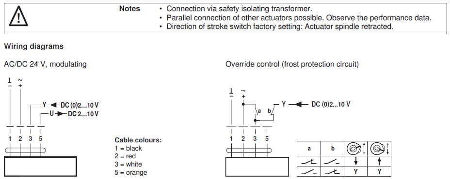 | Emergency setting position | Actuator spindle 0...100%, adjustable (POP rotary button) |