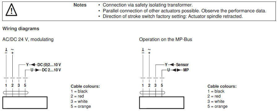 При управлении по MP-Bus сети в качестве управляющего сигнала выступает цифровой сигнал высшего уровня, согласно которому привод перемещает шток. При этом сигнал U не показывает текущее положение привода, а является лишь коммуникационным интерфейсом.