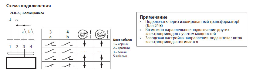 Заводская настройка: шток электропривода втянут. В случае поставки клапана с установленным на него привод Belimo NVK24A-3-TPC поворотный привод Belimo — направление движения устанавливается в соответствии с точкой запирания клапана.