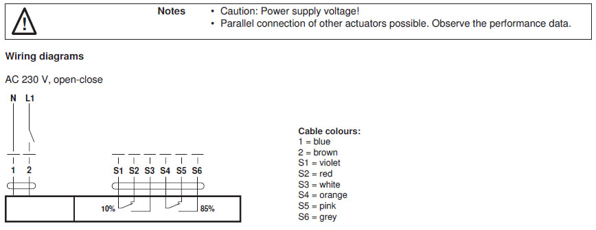 | Connection auxiliary switch | Cable 1 m, 6 x 0.75 mm² |