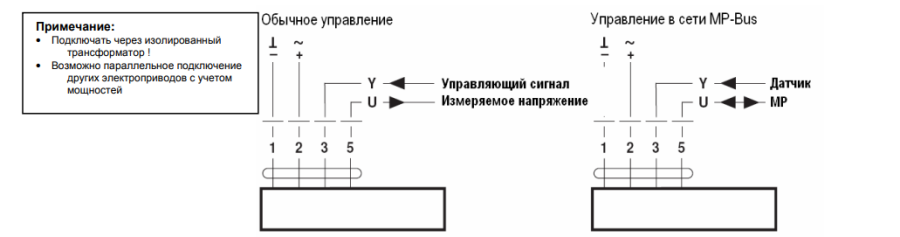 Возможно подключение датчиков, передающих аналоговый сигнал, который конвертируется в цифровой с помощью MP привода, а затем через MP-Bus сеть передается в управляющую систему высшего уровня.