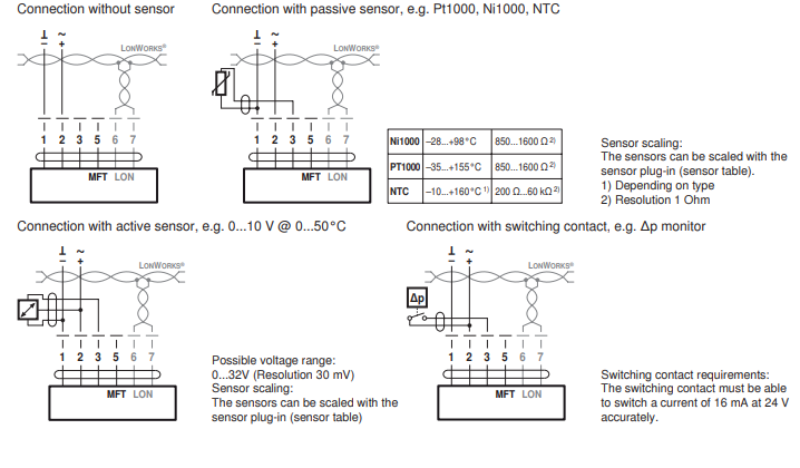 Предусмотрено подключение к электроприводу Belimo SR24ALON активных либо пассивных преобразующих датчиков, а также переключающих контактов. Благодаря этому возможно легко оцифровать аналоговый сигнал и передать в LONWORKS®.